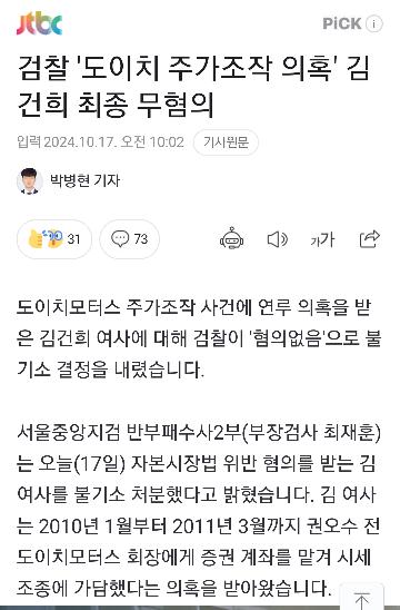 관련게시물 :김모 씨 편지 “김건희 너도 공범이잖아”- 관련게시물 :[속보]1차 주포 “김건희, ‘아저씨 주식 사야겠네’” 진술2010년 10월 20일 이전에 이뤄졌던 도이치모터스 1차 주가조작에서 이른바 ‘주포’ 역할을 했던 이모 씨.하지만 검찰은 이후에도 이 씨가 김 여사에게 증권업계의 A 씨를 소개해줬고, A 씨로부터 “주식을 잘 관리해주겠다”는 얘기를 듣고 동부증권으로 계좌를 옮겼다는 진술을 확보했습니다.A 씨는 또 “권 회장이 사업가로는 별로”라며 도이치모터스 주식을 팔라고 권유했고, 이후 ‘주포’ 이 씨는 자신이 주식을 팔아주겠다는 취지로 김 여사에게 전화했던 것으로 전해졌습니다.이 씨와 통화한 김 여사는 2010년 6월 25일 동부증권에서 대신증권으로 다시 한 달 만에 계좌를 옮겼습니다.신한증권 계좌에서 돈을 뺐던 2010년 5월 이후에도 ‘주포’ 이 씨와 연락했던 것으로 볼 수 있는 대목입니다.다만 이 시기는 법원이 공소시효가 만료됐다고 판단한 2010년 10월 20일 이전입니다.김 여사는 2010년 5월 이후부터는 자신이 직접 도이치모터스 주식을 거래했다는 주장을 펴고 있는데, 검찰은 김 여사가 주가조작 사실을 알고 있었다는 증거와 진술은 부족하다고 보고 있습니다.검찰은 이르면 이번주 김 여사 처분 방향을 정할 것으로 알려졌습니다.https://n.news.naver.com/article/056/0011814119?sid=102관련게시물 :김모 씨 편지 “김건희 너도 공범이잖아”- 관련게시물 :[속보]1차 주포 “김건희, ‘아저씨 주식 사야겠네’” 진술2010년 10월 20일 이전에 이뤄졌던 도이치모터스 1차 주가조작에서 이른바 ‘주포’ 역할을 했던 이모 씨.하지만 검찰은 이후에도 이 씨가 김 여사에게 증권업계의 A 씨를 소개해줬고, A 씨로부터 “주식을 잘 관리해주겠다”는 얘기를 듣고 동부증권으로 계좌를 옮겼다는 진술을 확보했습니다.A 씨는 또 “권 회장이 사업가로는 별로”라며 도이치모터스 주식을 팔라고 권유했고, 이후 ‘주포’ 이 씨는 자신이 주식을 팔아주겠다는 취지로 김 여사에게 전화했던 것으로 전해졌습니다.이 씨와 통화한 김 여사는 2010년 6월 25일 동부증권에서 대신증권으로 다시 한 달 만에 계좌를 옮겼습니다.신한증권 계좌에서 돈을 뺐던 2010년 5월 이후에도 ‘주포’ 이 씨와 연락했던 것으로 볼 수 있는 대목입니다.다만 이 시기는 법원이 공소시효가 만료됐다고 판단한 2010년 10월 20일 이전입니다.김 여사는 2010년 5월 이후부터는 자신이 직접 도이치모터스 주식을 거래했다는 주장을 펴고 있는데, 검찰은 김 여사가 주가조작 사실을 알고 있었다는 증거와 진술은 부족하다고 보고 있습니다.검찰은 이르면 이번주 김 여사 처분 방향을 정할 것으로 알려졌습니다.https://n.news.naver.com/article/056/0011814119?sid=102관련게시물 :김모 씨 편지 “김건희 너도 공범이잖아”관련게시물 :김모 씨 편지 “김건희 너도 공범이잖아” 김모 씨 편지 “김건희 너도 공범이잖아” 관련게시물 :[속보]1차 주포 “김건희, ‘아저씨 주식 사야겠네’” 진술관련게시물 :[속보]1차 주포 “김건희, ‘아저씨 주식 사야겠네’” 진술 [속보]1차 주포 “김건희, ‘아저씨 주식 사야겠네’” 진술 2010년 10월 20일 이전에 이뤄졌던 도이치모터스 1차 주가조작에서 이른바 ‘주포’ 역할을 했던 이모 씨. 2010년 10월 20일 이전에 이뤄졌던 도이치모터스 1차 주가조작에서 이른바 ‘주포’ 역할을 했던 이모 씨. 하지만 검찰은 이후에도 이 씨가 김 여사에게 증권업계의 A 씨를 소개해줬고, A 씨로부터 “주식을 잘 관리해주겠다”는 얘기를 듣고 동부증권으로 계좌를 옮겼다는 진술을 확보했습니다. 하지만 검찰은 이후에도 이 씨가 김 여사에게 증권업계의 A 씨를 소개해줬고, A 씨로부터 “주식을 잘 관리해주겠다”는 얘기를 듣고 동부증권으로 계좌를 옮겼다는 진술을 확보했습니다. A 씨는 또 “권 회장이 사업가로는 별로”라며 도이치모터스 주식을 팔라고 권유했고, 이후 ‘주포’ 이 씨는 자신이 주식을 팔아주겠다는 취지로 김 여사에게 전화했던 것으로 전해졌습니다.이 씨와 통화한 김 여사는 2010년 6월 25일 동부증권에서 대신증권으로 다시 한 달 만에 계좌를 옮겼습니다. A 씨는 또 “권 회장이 사업가로는 별로”라며 도이치모터스 주식을 팔라고 권유했고, 이후 ‘주포’ 이 씨는 자신이 주식을 팔아주겠다는 취지로 김 여사에게 전화했던 것으로 전해졌습니다. 이 씨와 통화한 김 여사는 2010년 6월 25일 동부증권에서 대신증권으로 다시 한 달 만에 계좌를 옮겼습니다. 신한증권 계좌에서 돈을 뺐던 2010년 5월 이후에도 ‘주포’ 이 씨와 연락했던 것으로 볼 수 있는 대목입니다.다만 이 시기는 법원이 공소시효가 만료됐다고 판단한 2010년 10월 20일 이전입니다. 신한증권 계좌에서 돈을 뺐던 2010년 5월 이후에도 ‘주포’ 이 씨와 연락했던 것으로 볼 수 있는 대목입니다. 다만 이 시기는 법원이 공소시효가 만료됐다고 판단한 2010년 10월 20일 이전입니다. 김 여사는 2010년 5월 이후부터는 자신이 직접 도이치모터스 주식을 거래했다는 주장을 펴고 있는데, 검찰은 김 여사가 주가조작 사실을 알고 있었다는 증거와 진술은 부족하다