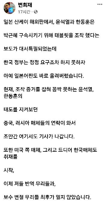 변희재 태블릿썰 산케이신문 보도 근황. 내가 참..살다살다 변씨 페북을 다 보고있네.