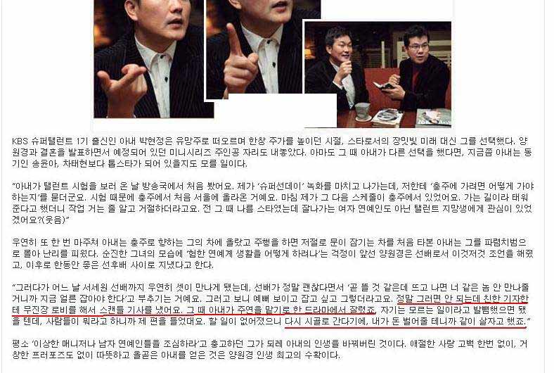 1> 마누라가 "남편 양원경이 차 안에서 옷을 갈아입는다는 제보를 받고 너무 놀라 지하주차장으로 뛰어 내려갔더니 정말 남편이 속옷만 입고 있었다고 함. 십중 팔구 바람피고 증거 없애려고 옷 갈아입은 거. 이에 양원경은 "아내 눈치 때문에 몰래 옷을 갈아입을 수 밖에 없었다"고 얼척없는 변명. 2> 마누라가 영양제를 사서 개같이 잔소리한 다음날 자기는 비싼 팬티 10장을 사옴. '한 장만 사려고 했는데 백화점 직원이 자기를 알아봐 적게 살 수 없었다. 마침 무지개♡ 요일 팬티가 있었다'며 '게다가 10장을 딱 맞춰 사면 할인이었다'고 해명 딱봐도 불륜 대책용 갈아입을 팬티... 3> 신혼여행 갔을 때 결혼 10주년 때는 다이아 반지 1캐럿과 하와이로 꼭 다시 여행 오자고 약속 막상 결혼 10주년 날 박현정 왈 '그것보다 가장 큰 선물을 줬다. 집에 들어오질 않았다. ‘왜 저 사람과 살까?’란 생각을 했다' 양원경이 말하기를 돈이 주머니에 60만원 정도 밖에 없었다. 사주고 싶은 반지가 80만원이었는데 돈이 모자랐다. 선물을 마련하려고 후배들과 내기 당구를 쳤다. 새벽 4시까지 쳤는데 돈을 다 잃었다고 함 4> 양원경이 놀이공원 가자고 해놓고 갑자기 마누라랑 애들더러 먼저 가있으라고 말함. 마누라랑 애들이 놀이공원에서 아무리 기다려도 양원경이 안옴. 하루종일 안오다가 니들끼리 놀라고 난 안간다고 전화함. 5>생활비가 없어서 마누라가 돈 달라고 했더니 없다고 함. 3달동안 생활비를 주지 않았는데, 나중에 마누라가 양원경 지갑을 봤더니 현금이 꽉차있었음. 왜 없다고 했냐고 묻자 해명은 안하고 지갑 뒤진것갖고 화만 냄. 급기야 내가 번 돈을 왜 아내한테 생활비로 줘야하냐고 말함. 그래놓고 요새 아내가 돈 잘번다고 자랑함. 내돈은 내돈 아내돈도 내돈? 6> 딸 저금통 털어서 오락실에 감. 마누라가 왜 그랬냐고 묻자 그냥 오락실이 가고싶었다고 함. 덧붙혀 어차피 딸 돈도 자기가 준 돈이라 괜찮다는 희한한 논리를 폄. 7> 마누라가 슈퍼탤런트에 합격했으나 활동 못하게 함. 이유는 뜨면 자길 버릴까봐서. 그리고 그러라고 조언한 사람은 서세원. 마누라는 양원경 반대로 연예인 활동은 못하고 대신 바리스타로 커피숍에서 알바뛰고있음.