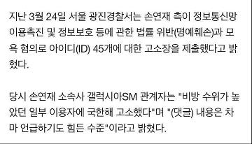 (서울=연합뉴스) 안홍석 기자 = 서울남부지법 형사11단독 박나리 판사는 전 리듬체조 국가대표 선수 손연재(23)씨를 비방하는 인터넷 댓글을 단 혐의(모욕)로 약식기소된 서모(30)씨에게 벌금 30만원을 선고했다고 2일 밝혔다.서씨는 올 2월 18일 한 인터넷 커뮤니티에 올라온 손씨의 은퇴 관련 기사 게시물에 '후원자 빠지니 더 X되기 전에 은퇴코스 밟네. 미적거렸다간 욕만 더 먹고 끝났을테니'라는 댓글을 단 혐의로 재판에 넘겨졌다.서씨는 경찰 조사에서 "손씨가 이른바 '최순실 게이트'와 관련해 뉴스에 많이 나와 해당 댓글을 썼다"고 진술했다.손씨 소속사는 2월 18일 손씨가 해마다 참여했던 '모스크바 그랑프리' 국가대표 선발전에 불참하며 은퇴한다고 발표했다. 그러자 일부 네티즌들이 손씨와 최순실씨를 연관 짓는 비방성 게시글과 댓글을 인터넷에 대거 올렸다. 손씨 측은 같은해 3월 서씨를 비롯해 비방 댓글을 단 누리꾼 45명을 모욕·명예훼손 혐의로 경찰에 고소했다.손씨는 2014 인천 아시안게임과 2015 광주 하계유니버시아드에서 각각 한국 리듬체조 사상 첫 개인종합 금메달을 획득했다. 올림픽에서는 2012 런던 대회에서 개인종합 5위, 2016 리우 대회에서 개인종합 4위의 성적을 거뒀다. --------------- 요즘은 팩트도 걸리는 듯....