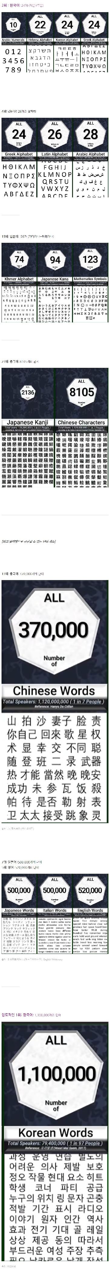다 알듯이 모음은하늘 ㆍ땅 ㅡ사람 ㅣ으로 이루어져있지요.그리고 이중 가장 고귀한건 하늘과 땅을 잇는 사람... 땅위에 하늘(해)가 있으면 양, ㅗ땅아래 하늘이 있으면 음, ㅜ 북극성이 있는 북쪽하늘을 바라보고사람 오른쪽에 있는 하늘, 즉 뜨는 해가 있는 곳은 양, ㅏ사람 왼쪽에 있는 서쪽하늘은 음, ㅓ 양성모음끼리는 합용이 가능함, ㅗ와 ㅏ를 합쳐 ㅘ음성모음끼리도 합용가능, ㅜ와 ㅓ를 합쳐 ㅝ그러나 양과 음을 합칠수는 없음, ㅗ와 ㅓ는 합쳐서 모음을 이루지 못함, 마찬가지로 ㅜ와 ㅏ도 합용되지 못함 하지만 하늘과 땅을 잇는 고귀한 사람은 어디에나 합용이 가능함양성모음 ㅗ나 ㅏ에 사람(ㅣ)을 합치면 ㅚ와 ㅐ가 되고음성모음 ㅜ나 ㅓ에 사람을 합치면 ㅟ와 ㅔ가 됨. 땅에 사람을 합용하면 ㅢ하늘에 사람을 합용하면 지금은 쓰이지 않는 ㆍㅣ더군다나 이미 합쳐진 ㅝ와 ㅘ 등에도 사람은 합용이 가능, ㅞ와 ㅙ가 됨 나랏말싸미 보고 모음에 점에 짝대기 하나만 더 쓰자고 한 황당한 내용을 보고 열받아 적었습니다.